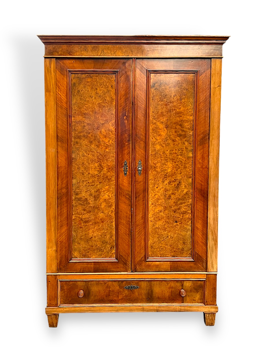 Dieser antike Schrank stammt aus der Zeit der Gründerzeit und überzeugt durch seine harmonisch proportionierte Form und den charaktervollen Einsatz edler Materialien. Die Türen sind mit prächtigen Wurzelholz-Furnieren gestaltet und werden von fein eingelegten Rahmen aus Nussbaum flankiert – ein typisches Merkmal der Epoche.